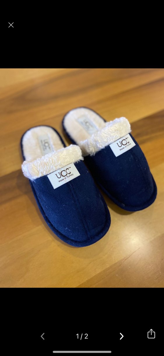 UCC kadın lacivert ev terliği, yumuşak ve sıcak kumaş, kürk detayları ile günlük kullanım için uygundur. 2 adet mevcuttur 37 numara