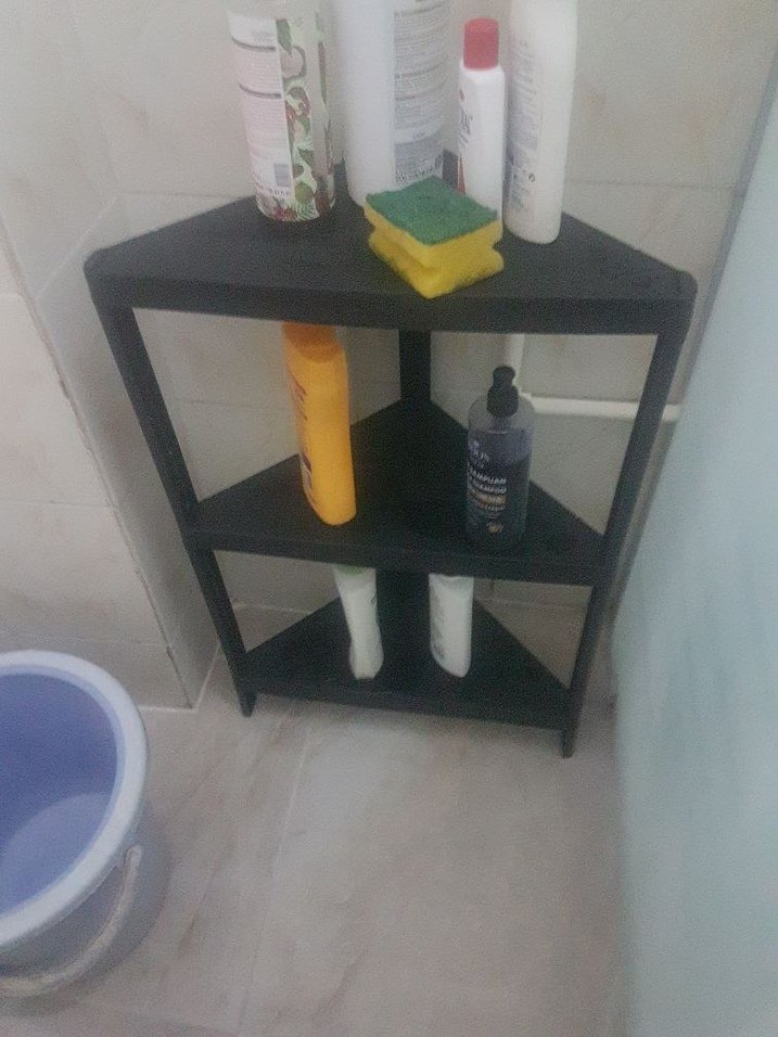uc katlı siyah köşe rafı, banyo malzemelerini düzenlemek için uygun. Kompakt tasarımı küçük alanlara uyum sağlar. evinizin her kosedinde kullanima uygundur sert kaliteli pilastik paketli gondirim yapilacak gorsel fotodur