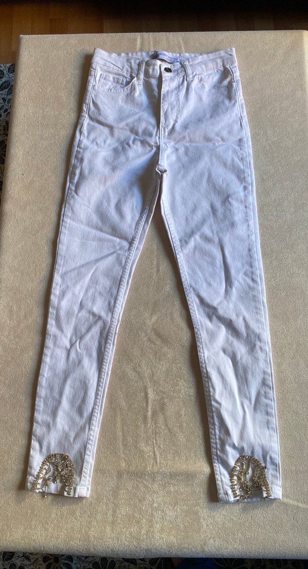 Uçlarında taş detayları var Beyaz Kadın Denim Pantolon