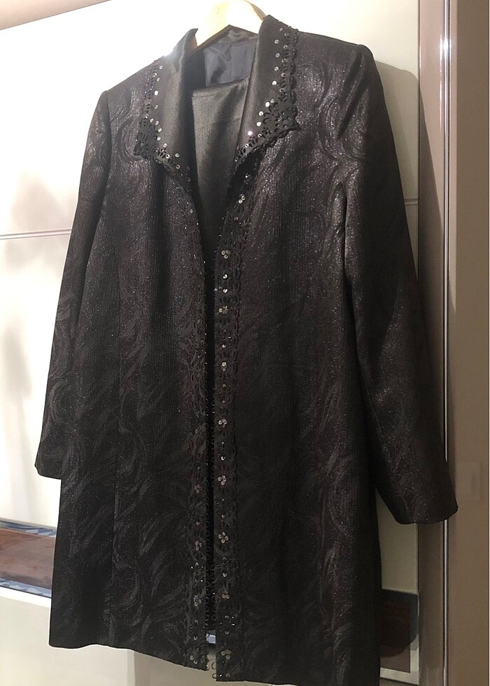 Annem kardeşimin düğününde kullandı. 50 beden bluz etek ve ceket. Ceket boyu 95 cm, etek boyu 95 cm’dir. Gayet iyi durumdadır.