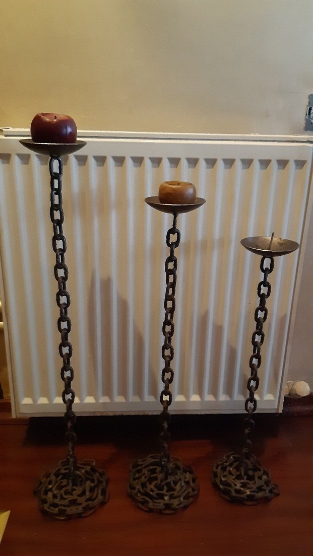 68cm-60cm-52cm boylarda ağır ham demir zincir üçlü rusyik yerden mumluk seti. Taban genişliği 15cm, mum koyulan iğneli tablası 10cm. #demirmumluk #zincirmumluk #yerdenmumluk #üçlümumluk #üçlüdemirmumluk #rustikmumluk #rustikdekorasyon #rustik #rustikşamdan