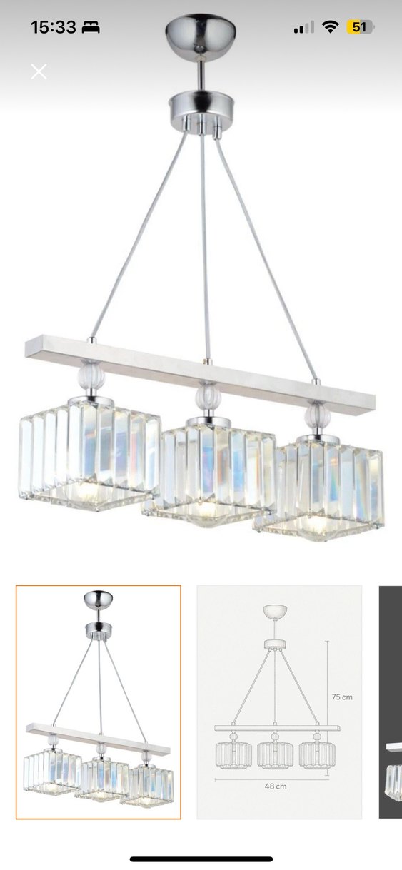 Üç beyaz kristal küp abajur, dikdörtgen çerçeveden sarkıtılmış, 75 cm ayarlanabilir kablo uzunluğuna sahip şık avize.