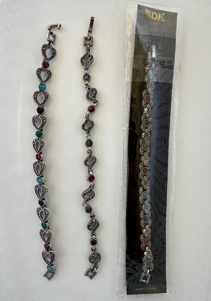 MARKA TEMSİLİDİR. Gümüş görünümlü ve renkli taşlı üçlü bileklik. Hediye geldi, hiç kullanılmadı. Bir tanesi ambalaj içinde. Uzunlukları yaklaşık 17 cm. Üçünün toplam fiyatıdır.