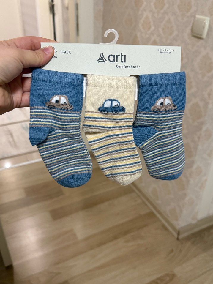 Nakışlı araba desenli ve çizgili mavi ile gri tonlarında, üçlü erkek çocuk çorap seti. Rahat kullanım sağlar. 18-24 aylık
