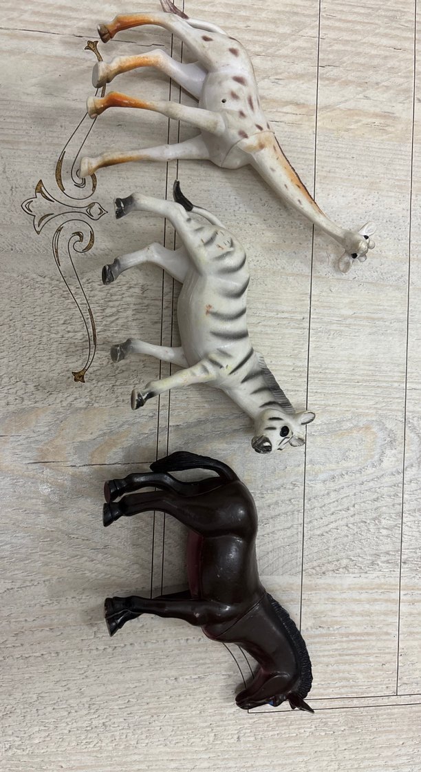 Beyaz ve koyu renklerde, detaylı işçilikle yapılmış zürafa, zebra ve at figürlerinden oluşan üçlü set.