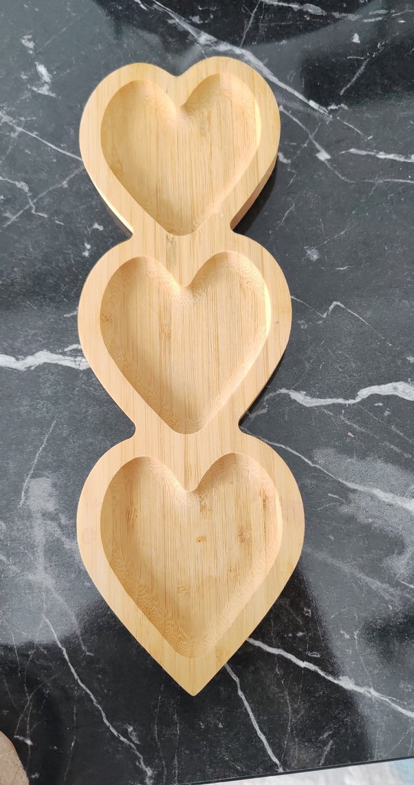 Doğal ahşaptan yapılmış, üç kalp şeklinde bölmesi olan bej renkli ahşap sunum tabağı çerez ve kahvaltılık için uygundur. ❤️