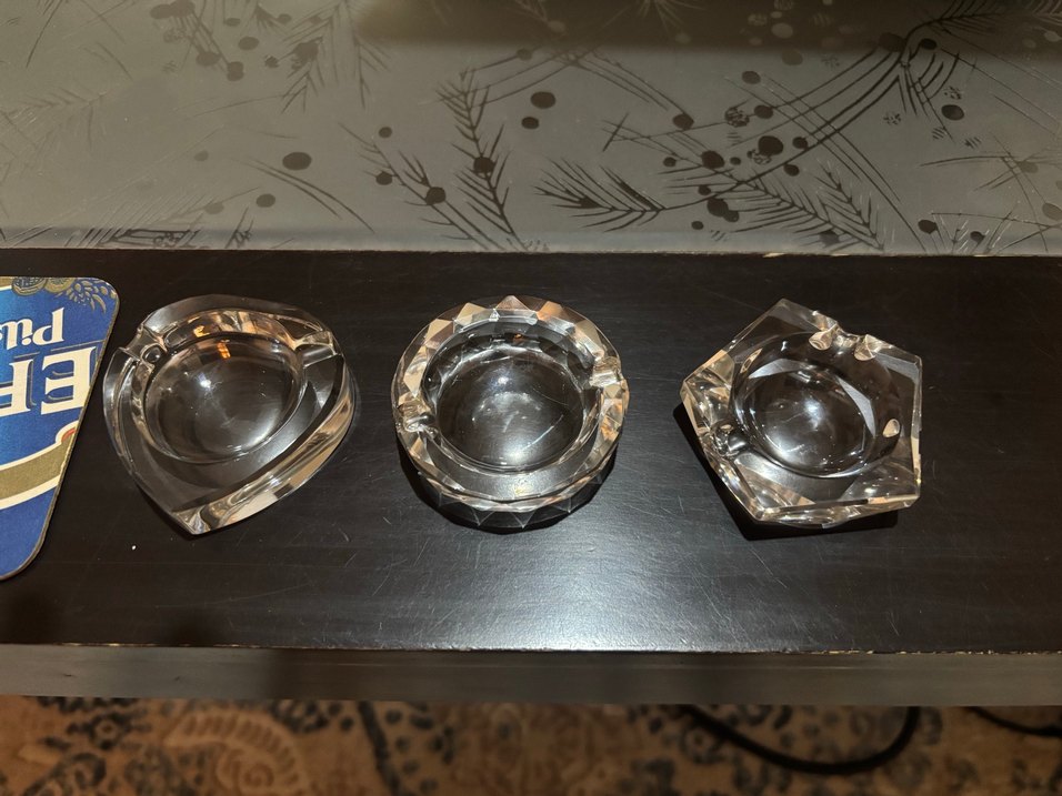 Bej renkli, koyu ve desensiz tasarıma sahip, counterculture tarzında üçlü kristal küllük seti. Her küllük farklı geometrik şekildedir. ️