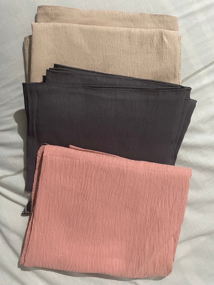 Bej, koyu gri ve soluk pembe renklerde, yumuşak keten kumaştan kadınlar için üç adet drape şal, minimalist bohem tarzda.