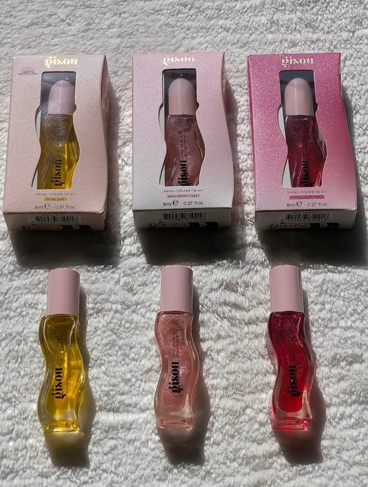 Dalgalı şişelerde üçlü pastel pembe dudak parlatıcısı seti, canlı ve parlak bir görünüm sağlar.
