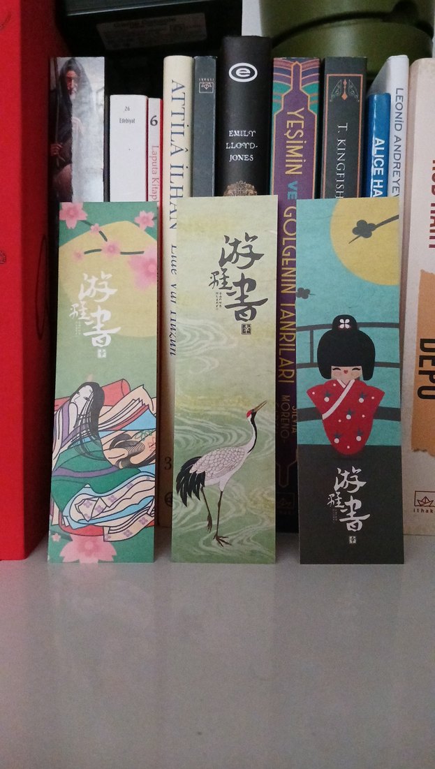 Geleneksel Asya desenleriyle süslenmiş, turna, çiçek ve bebek figürlü üçlü sanat kitap ayracı seti.