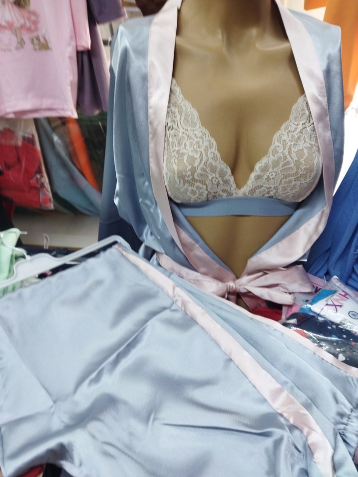 saten gri ve pembe renklerinde büstiyerli alt pijama ve sabahlık üçlü takım