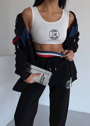 Spor baskılı beyaz mini atlet ve belden bağlamalı siyah eşofman altından oluşan şık ve rahat bir takım. S M L bedendir