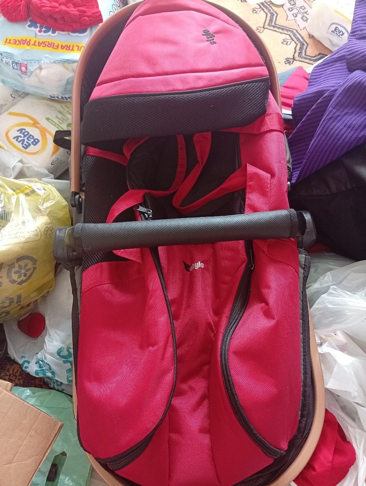 Koruyucu tutma barı ve yastıklı iç kısmı olan renkli pembe bebek arabası. Yeni doğan ve bebekler için uygundur.