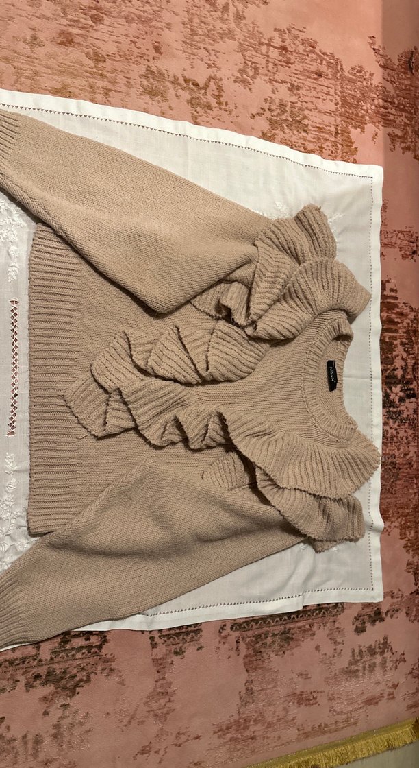 Uçuk pembe renkte, uzun kollu, triko kumaştan yapılmış, yuvarlak yakalı ve fırfır detaylı, vücuda oturan kadın kazak. Rahat ve şık, günlük kullanıma uygun. Örgü ve rahat kesimdir. Standart bedendir ancak L bedene kadar çok rahat kullanılabilir. Günlük ve iş yeri kullanımına uygundur.
