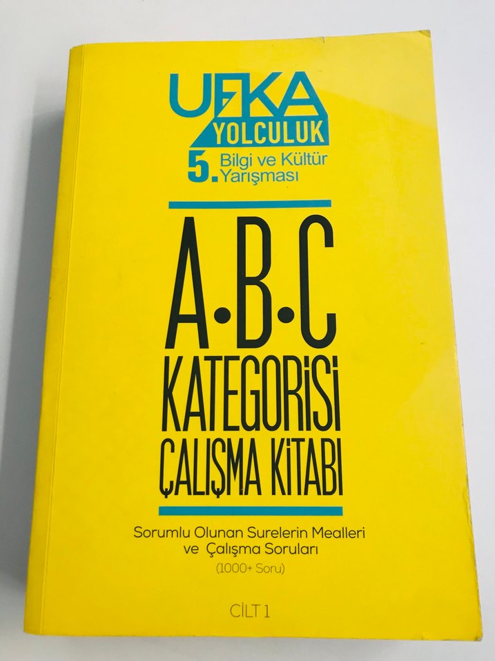 Sorumlu olunan surelerin mealleri ve 1000'den fazla çalışma sorusunu içeren sarı kapaklı UEKA Yolculuk bilgi yarışması çalışma kitabı.