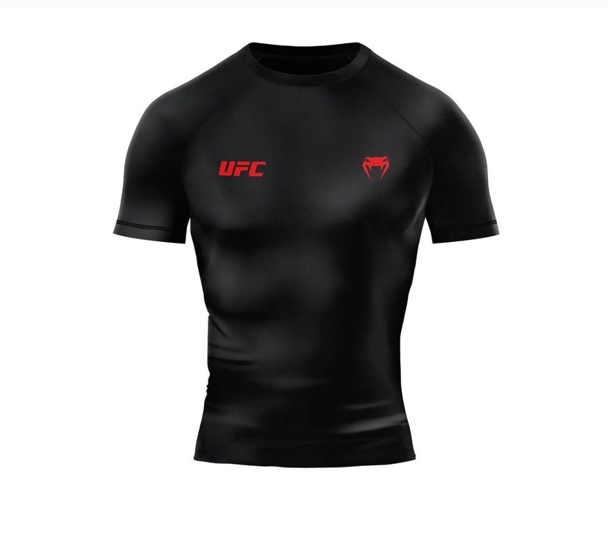 Erkekler compression için siyah, kısa kollu ve bisiklet yaka tişört. Sentetik kumaştan üretilmiş, UFC logosu ile spor ve sokak stilini birleştirir.