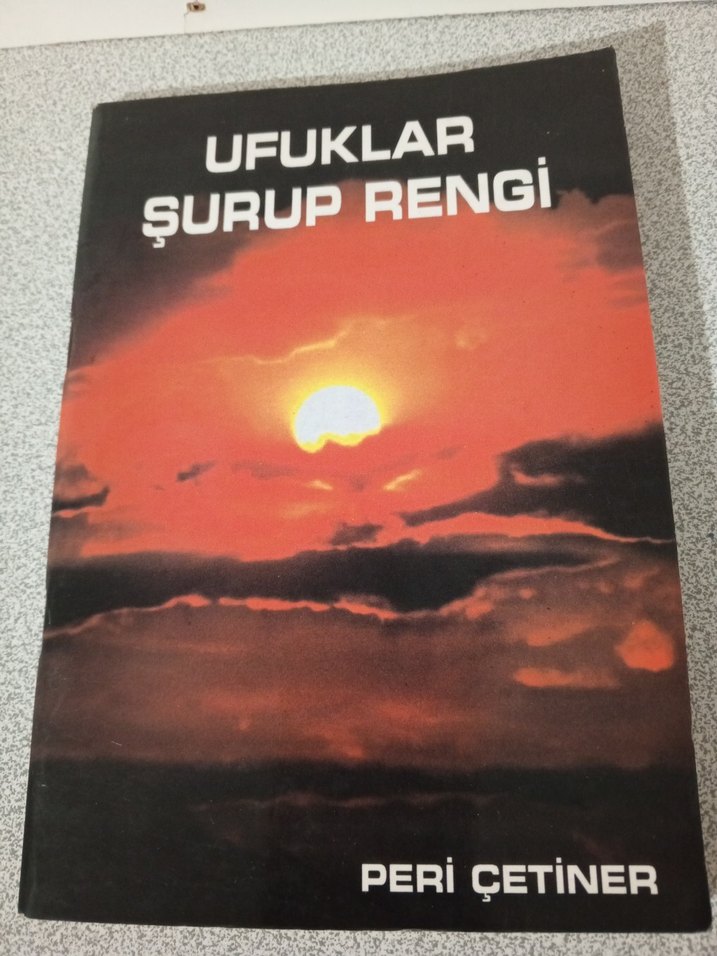 Peri Çetiner'in 'Ufuklar Şurup Rengi' kitabı, sıcak turuncu gökyüzüyle bir günbatımını kapağında gösteriyor.