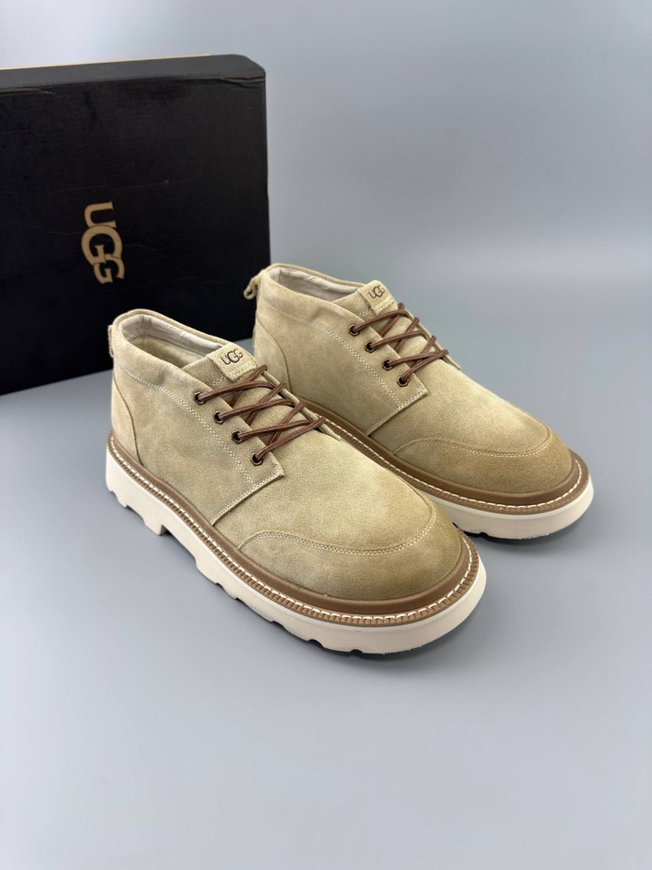 UGG markalı, bej süet erkek botları, dolgu topuklu ve desen içermeyen sade tasarımıyla günlük kullanıma uygun rahat sokak stilini sunar.