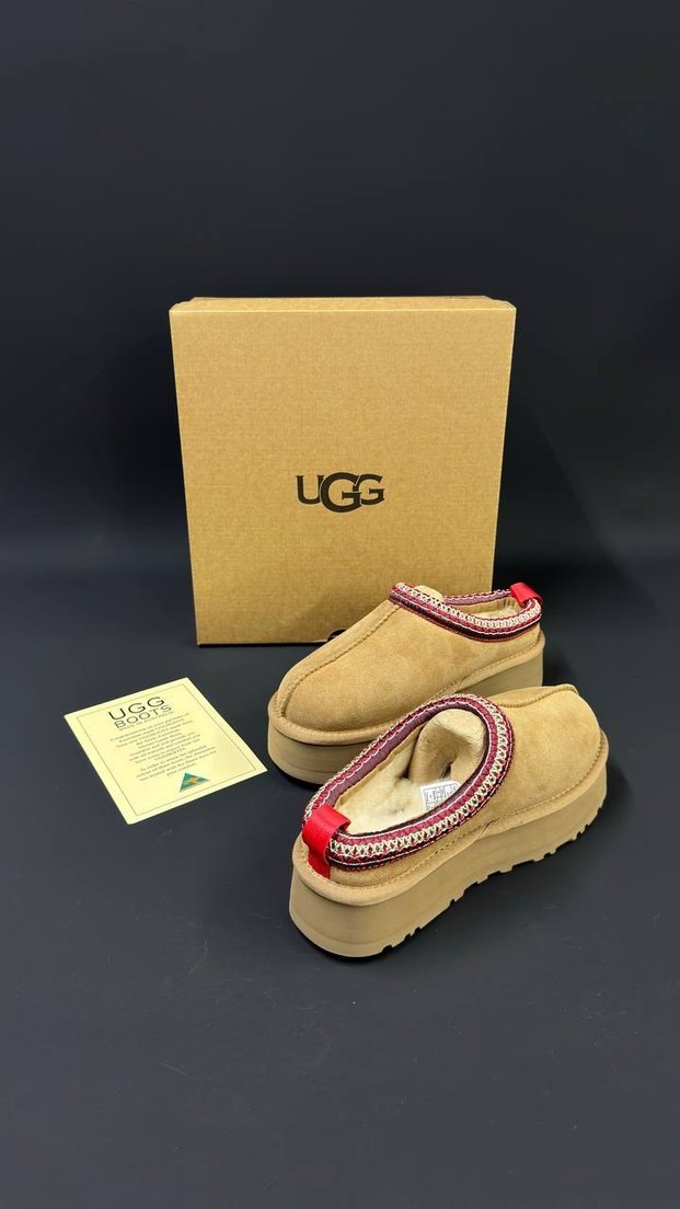 UGG markalı, süet malzemeden yapılmış bej renkli kadın terlikleri, platform topuk ve baskılı detaylarla rahat ve şık bir sokak stili sunar.