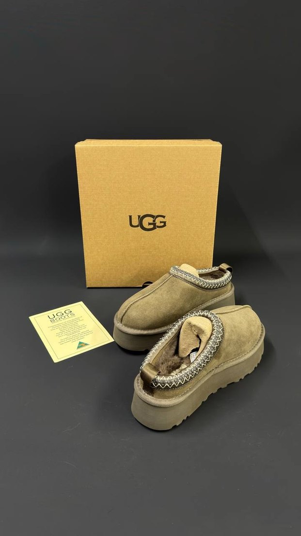 UGG markalı, bej süet malzemeden yapılmış, kemerli ve platform topuklu terlikler. Günlük kullanıma uygun, rahat ve şık bir seçenek.
