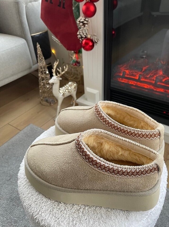 Bej süet kadın terlikler, kama topuklu, tüy detaylı ve nakışlıdır. Bohem tarz için uygundur, günlük kullanıma rahattır. Yeni etiketli iade kabul etmiyorum