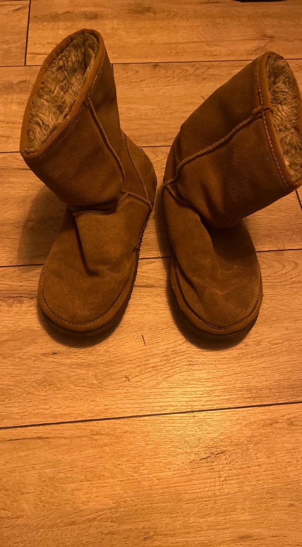 Uzun, camel rengi Ugg bot. Sol teki iyi durumda fakat sağ tarafı içe bastığım için yıpranmış durumda, açılma var, fotoğrafını çektim. İki ayağında içeriden taban kısmında tüyler epey aşındı, karton gibi bir malzeme çıkıyor topuk tarafından. Elden geçirilerek kullanılması lazım. Atmaya kıyamadığım için buraya yükledim.