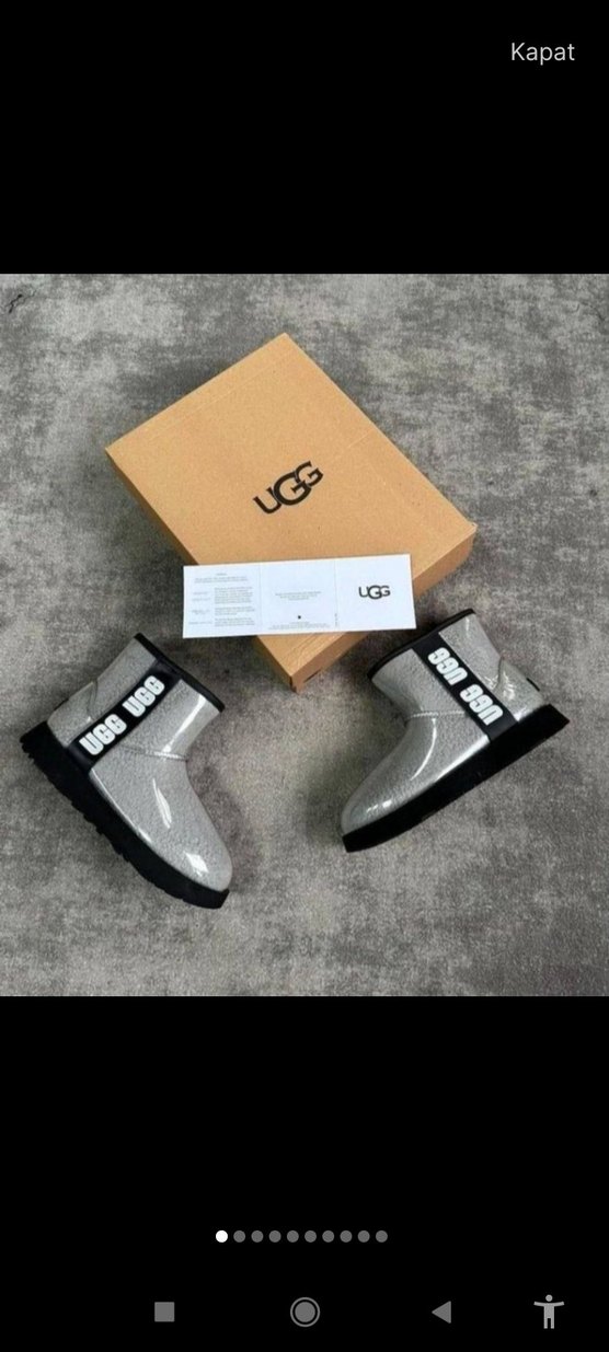 Gri renkli, bantlı ve blok topuklu UGG botlar. Kauçuk materyal ve baskılı desenle rahat ve şık bir sokak stili sunar.