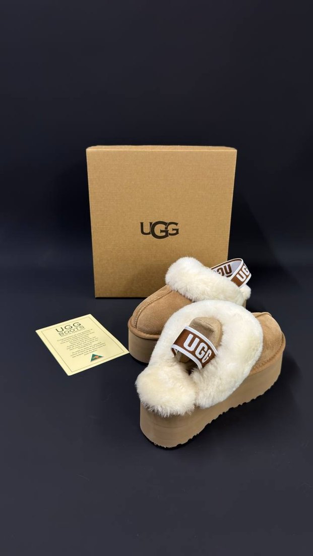 UGG markalı, bej renkte, kürklü ve dolgu topuklu kadın terliği. Yumuşak ve sıcak malzemeden üretilmiştir, günlük sokak stiline uygundur.