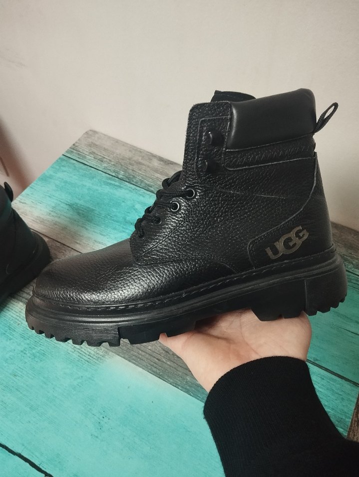 UGG siyah erkek bot, kauçuk malzemeden üretilmiş, bağcıklı ve dayanıklı tabanlı. Sokak stili ve günlük kullanım için uygun, desensiz ve koyu renkte.