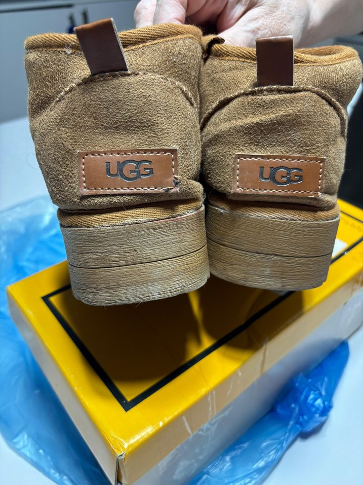 UGG marka, taba renk süet, dolgu topuk rahat kadın botu. Günlük kullanım için uygundur. orjinal değildir. önlerinde ve arkalarında kırılma var ancak kullanına engel değildir.
