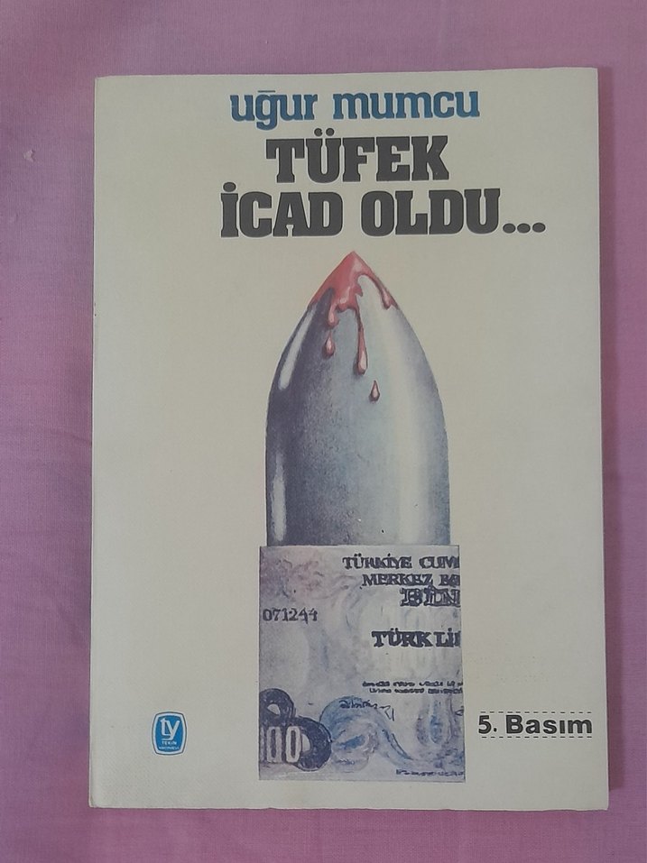 Uğur Mumcu'nun "Tüfek İcad Oldu" adlı kitabı, kan damlayan mermi görselli kapağıyla politik ve sosyal konuları ele alır. 5. basım.