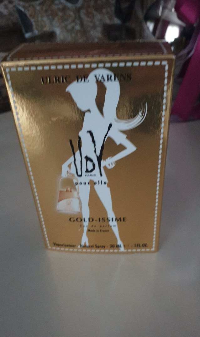 Ulric de Varens Gold-Issime kadın parfümü, 30 ml şişede sunulmaktadır. Altın renkli kutusunda kadın silueti figürü yer alır.