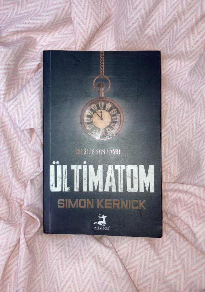 Simon Kernick'in "Ültimatom" adlı romanı, üzerindeki asılı saat görseliyle zamanın daraldığını simgeliyor. Olimpos yayınlarından.