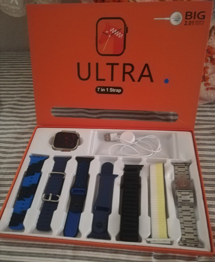 Ultra marka 7'si 1 arada çok renkli ve koyu tonlarda akıllı saat kayış seti. USB şarj kablosu ile birlikte gelir. Çeşitli bilek boylarına uyumludur.⌚Hiç kullanılmadı.