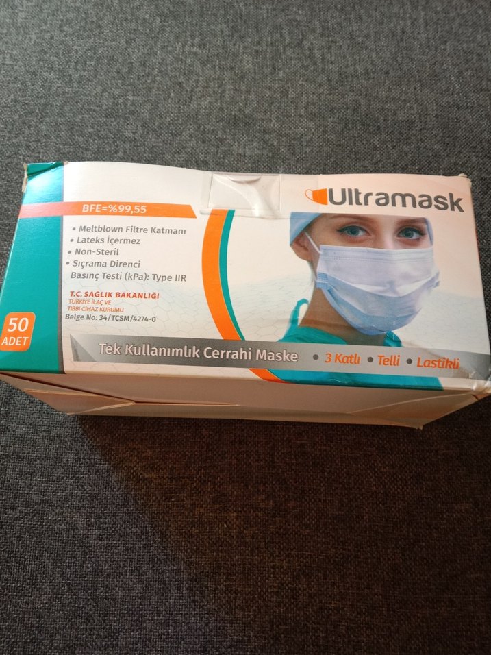 50 adet tek kullanımlık cerrahi maske, 3 katlı, tel ve lastikli. Lateks içermez, steril değildir, sıçrama direnci ve %99,55 filtreleme sağlar.