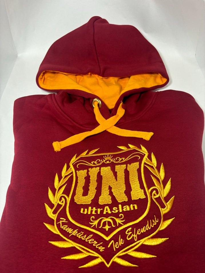 Bordo renkli, fitted kesim sweatshirt, kapüşonlu ve uzun kolludur. Önünde sarı renkli Uni ultrAslan baskısı ve içi sarı kapüşon detayları vardır. Yumuşak ve sıcak kumaştan üretilmiştir.