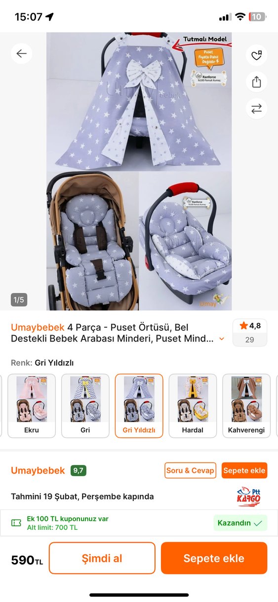 Umaybebek'in gri yıldız desenli dört parçalı seti, puset örtüsü ve bel destekli bebek arabası minderi içerir, bebeğiniz için konfor sağlar. Hiç kullanılmadı