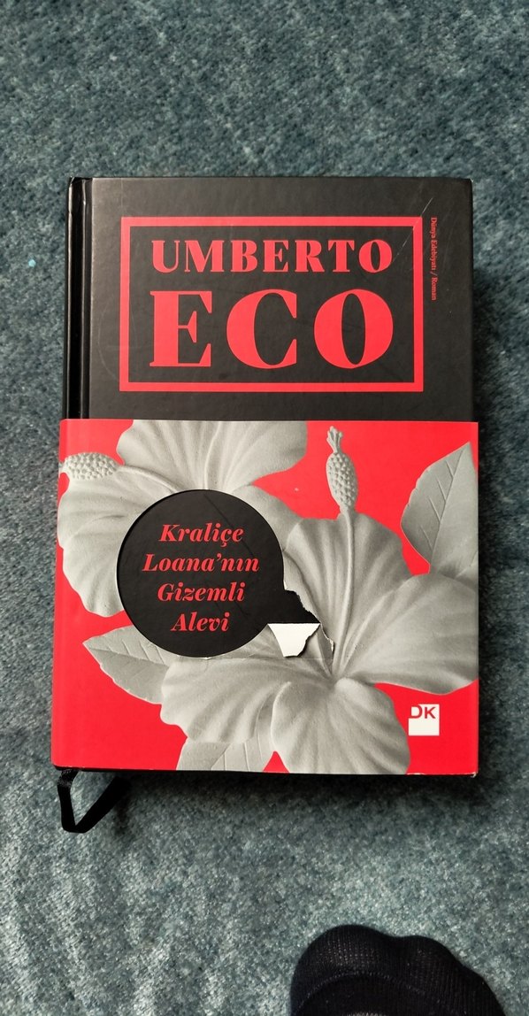 Umberto Eco'nun 'Kraliçe Loana'nın Gizemli Alevi' adlı kitabı, siyah ve kırmızı kapaklı, çiçek desenli bir üniversite kitabıdır. DK yayınevinden çıkmıştır.
