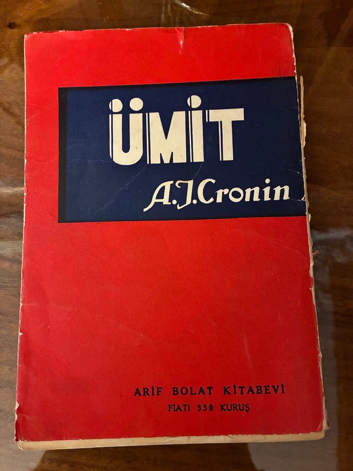 A.J. Cronin'in 'Ümit' adlı eski romanı. Kapağı kırmızı ve mavi renkli, kullanılmış. Arif Bolat Kitabevi tarafından yayımlanmıştır. Basım yılı 1951, 242 sayfa. Zamana bağlı kapakta ve sayfalarda yıpranma var, cilt dağılmış, sayfa sıralamasında sorun ve eksik yok.