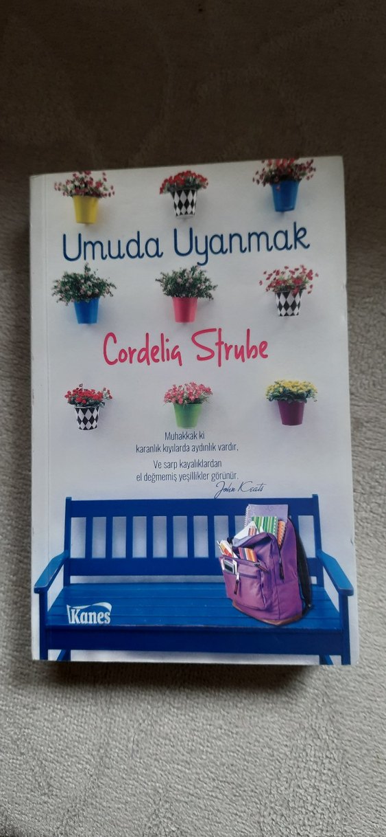 Cordelia Strube'nin Umuda Uyanmak kitabı, umut ve dayanıklılık üzerine ilham verici bir alıntı içerir. Kapakta renkli çiçek saksıları, mavi bir banka ve mor bir sırt çantası yer alır.