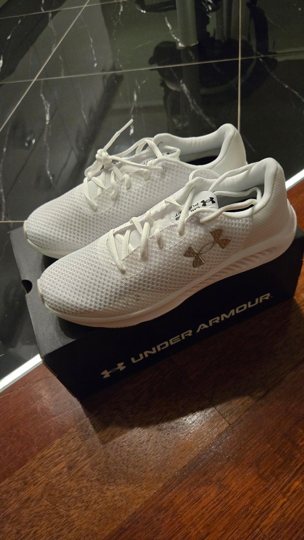 Nefes alabilir üst yüzey ve kauçuk tabana sahip beyaz Under Armour erkek spor ayakkabısı. Hafif ve desensiz, sportif ve günlük sokak stili için uygun.