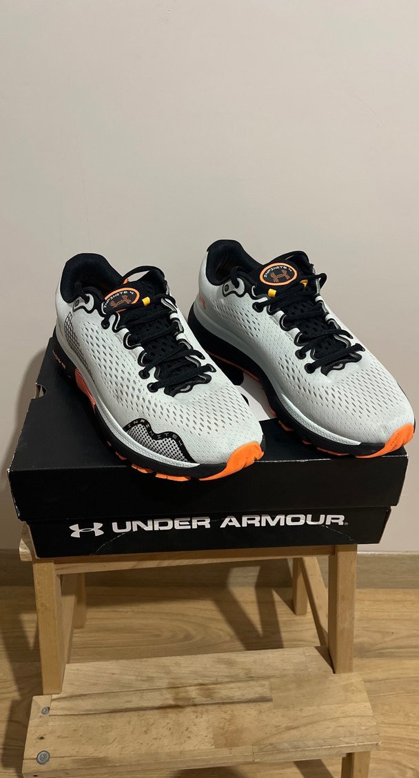 Under Armour beyaz ve gri baskılı erkek spor ayakkabısı, bağcıklı tasarım ve dayanıklı kauçuk tabanlıdır. Spor sokak stiline uygundur. 44.5 numara