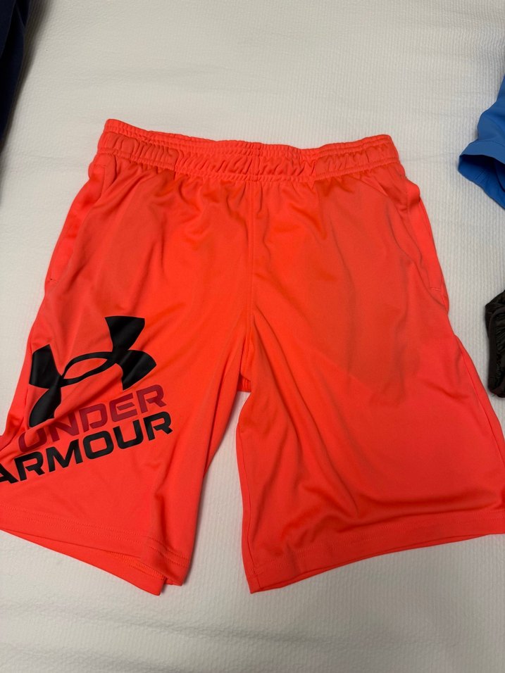 Kırmızı, fitted kesim Under Armour erkek çocuk şort, pürüzsüz sentetik kumaş ve büyük logo baskısı ile dikkat çekiyor.