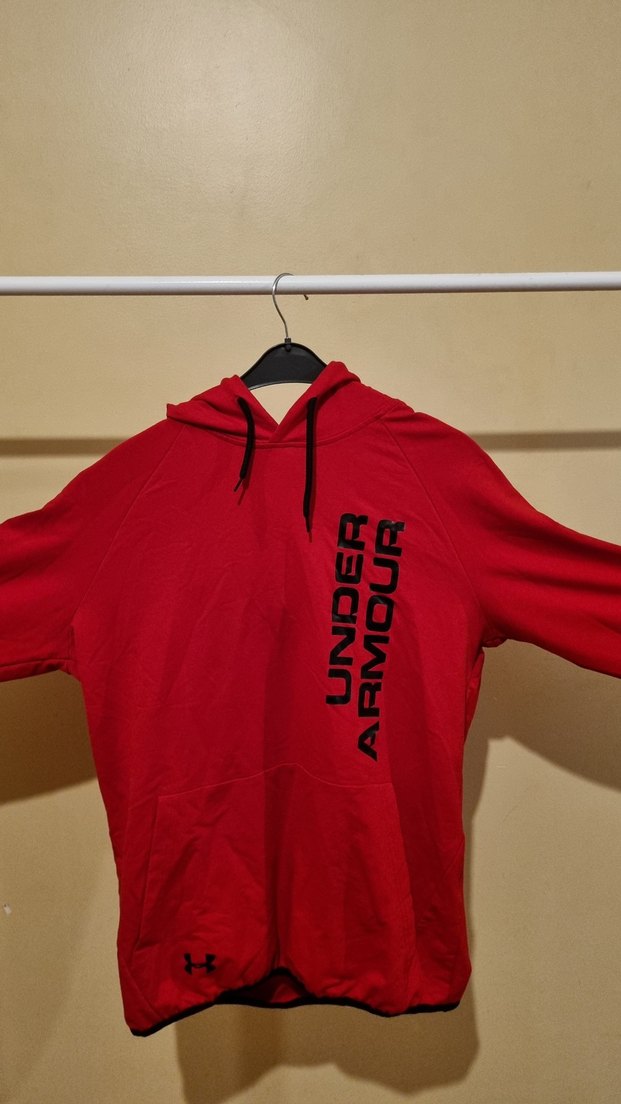 Bu kırmızı erkek sweatshirtü, yuvarlak yakalı ve uzun kolludur. Yumuşak kışlık kumaştan üretilmiş, rahat kesimiyle sportif ve sokak stili sunar. Under Armour logosu şıklık katıyor.