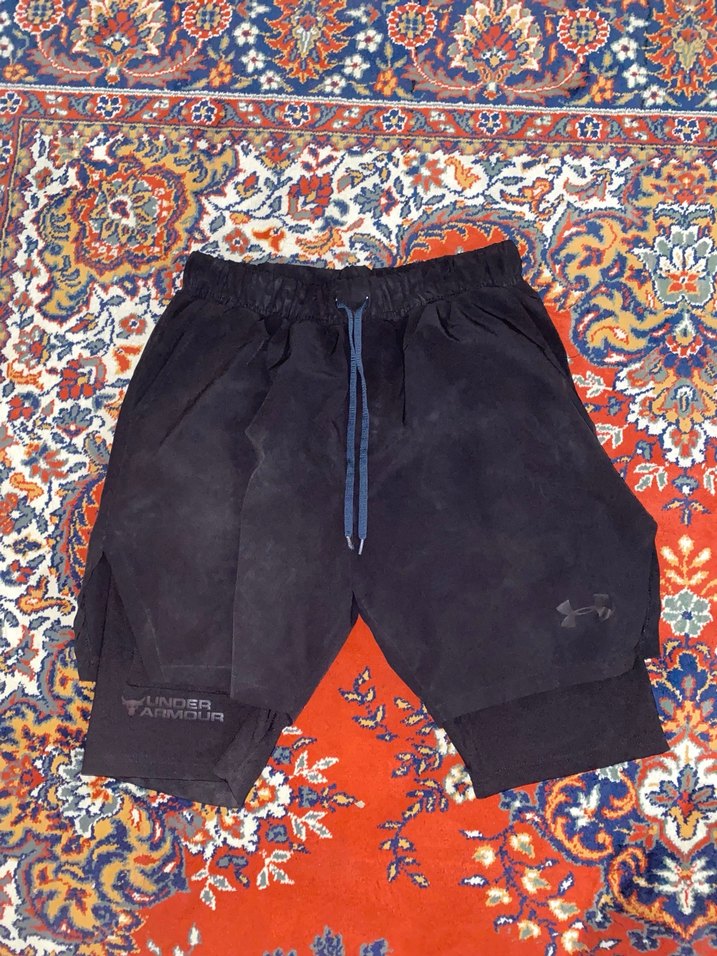 Under Armour siyah erkek şort, bağcıklı ve bol kesim. Sentetik kumaş ve hafif batik desenli, spor ve rahat stil için uygun. ♂️