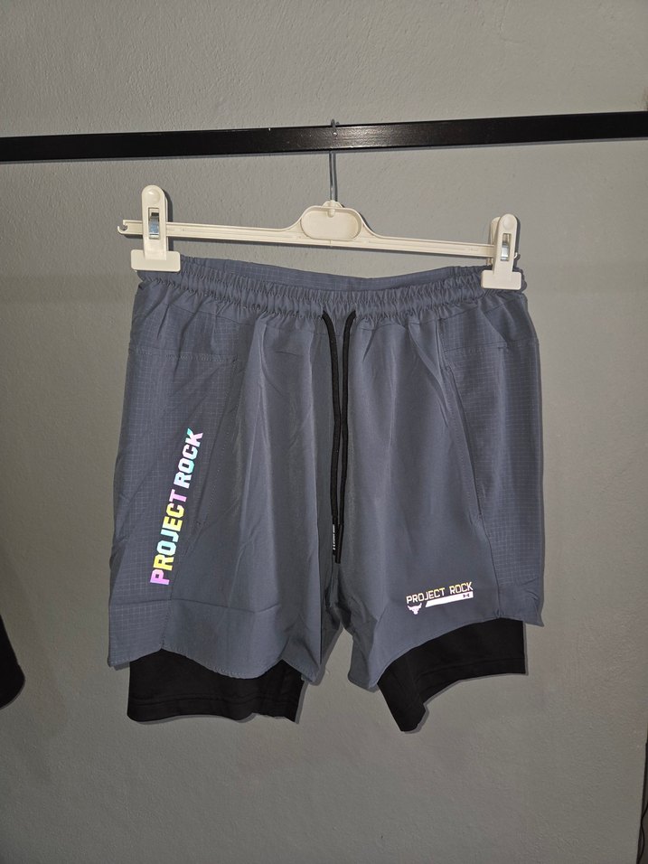 Gri renk, bol kesim erkek spor şortları, Project Rock baskılı ve Velcro detaylı, sentetik kumaştan üretilmiştir. bedenleri mevcuttur