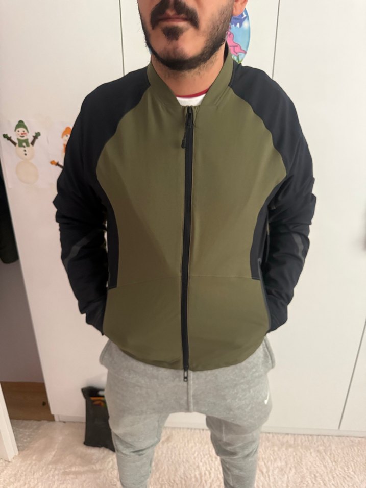 Haki ve siyah renklerde, fermuarlı ve uzun kollu erkek ceket. Dar kesim, bisiklet yaka ve midi boyda, günlük kullanıma uygun. İki kez giyildi