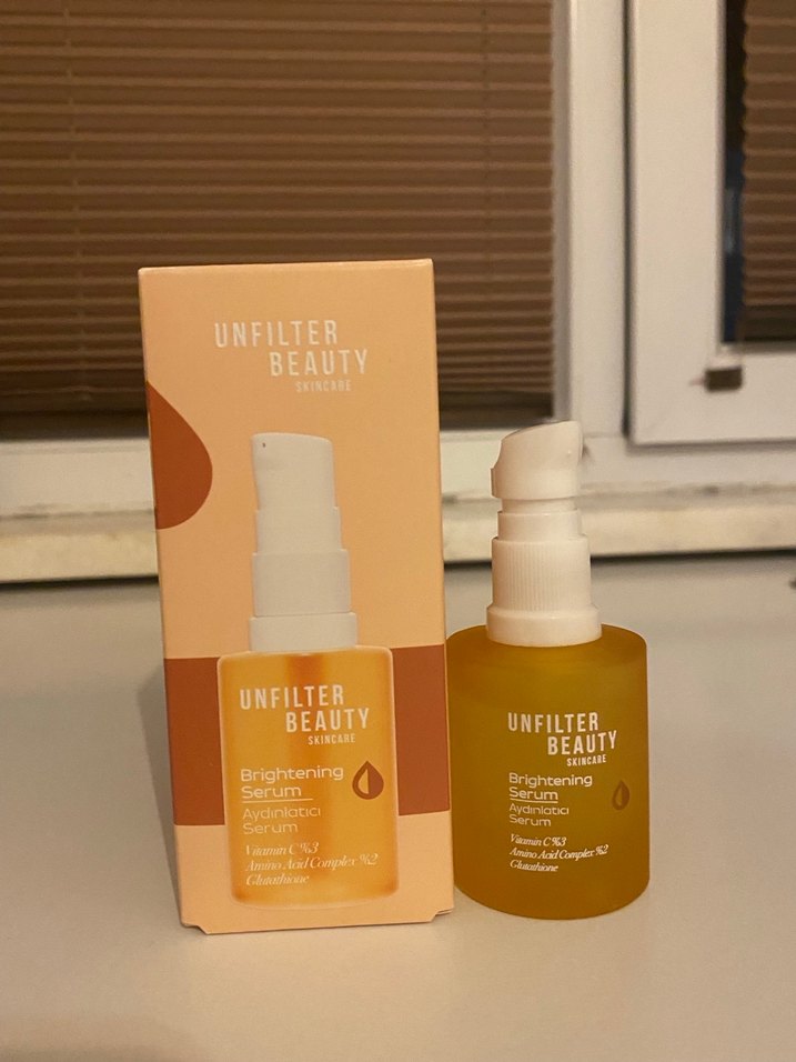 Unfilter Beauty Aydınlatıcı Serum, C ve E vitaminleri ile nemlendirir ve yaşlanma karşıtı etki sağlar. Ciltte parlaklık yaratır. COK AZ KULLANILDI görsellerde belli kutusu duruyor onunla göndericem
