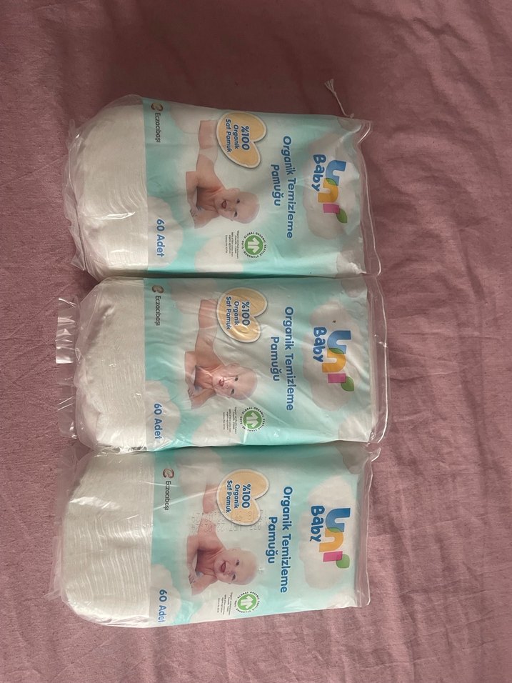 Uni Baby organik pamuk temizlik pedi 60 adetlik pakette sunulur. Yumuşak ve doğal malzeme hassas ciltler için uygundur.