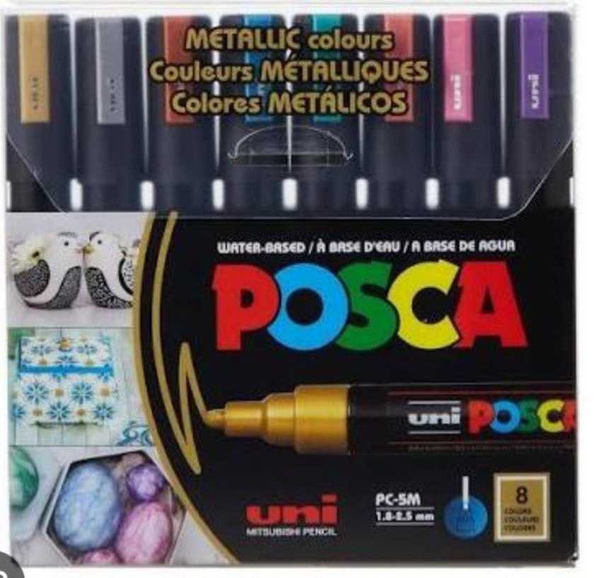 Uni Posca PC-5M kalem seti, 1.8-2.5 mm uç kalınlığı ile metalik renkler sunar. Su bazlı mürekkebiyle canlı metalik tonlar sağlar. ✒️